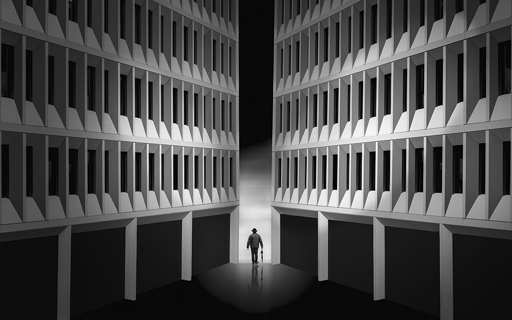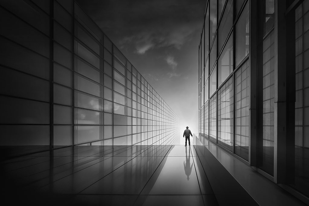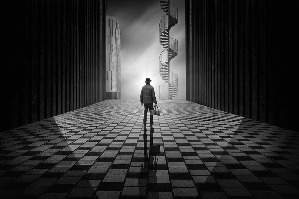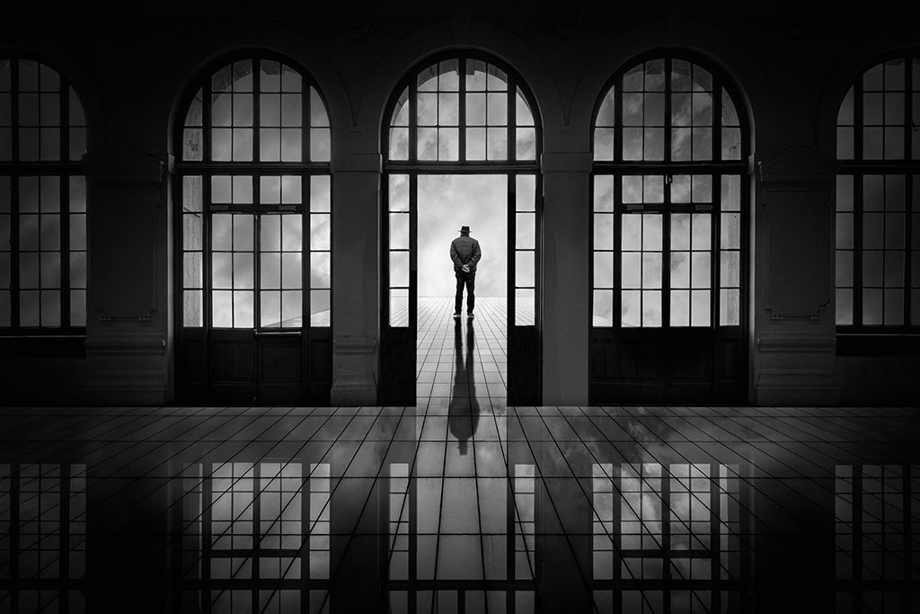 Mais peut-être aussi entre l’ombre et la lumière, entre le ciel et la terre, entre le rêve et la réalité ou entre l’homme et son ombre ou son reflet dans un miroir…